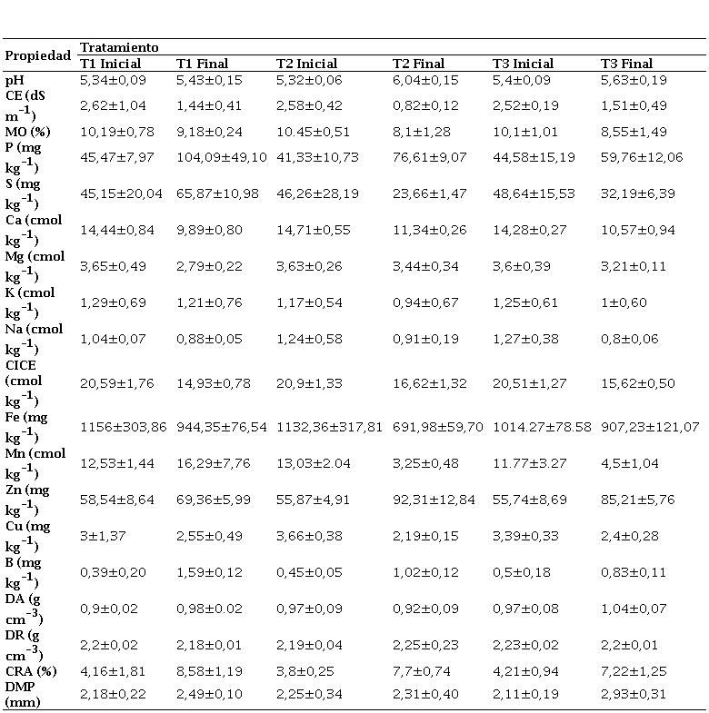 Table 2. Average values and standard deviation of the physical and chemical properties available in the soil at the beginning and end of the treatments.
