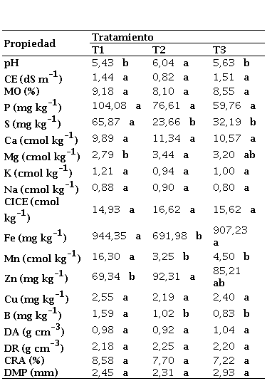 Table 3. Average values and results of the multiple comparison test (Tukey) of the different treatments of the physical properties and available in the soil of the treatments.