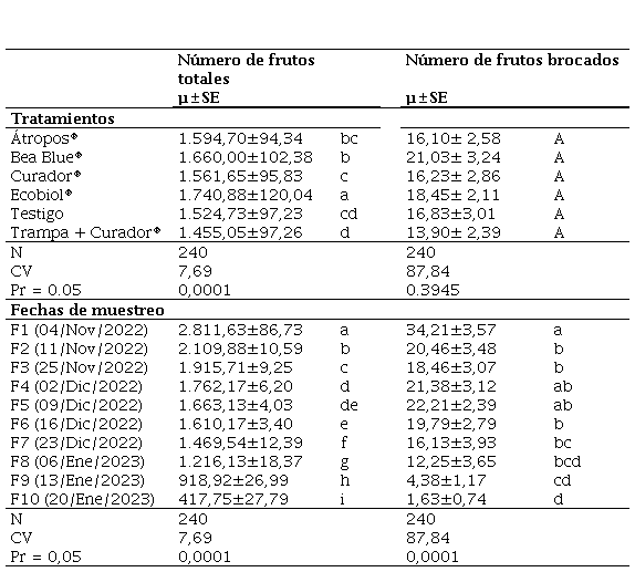 Table 1. Average of total fruits and brocades per treatment and sampling date (Tukey α: 0,05), in the coffee crop in Jalapa Nueva Segovia during the period 2022-2023.*