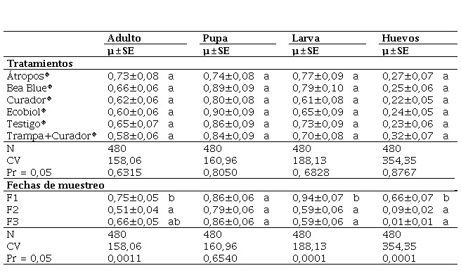 En cuanto a los diferentes estadios de desarrollo de la plaga no se encontraron diferencias significativas entre los tratamientos evaluados, no obstante, las fechas de muestreo uno y tres mostraron la mayor población promedio de pupas, larvas y huevos (Tabla 2). Esto conlleva a que en los subsiguientes muestreos las poblaciones de adultos sean mayores, ocasionando mayor porcentaje de daño a los frutos en desarrollo.