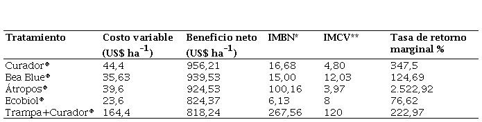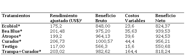 El análisis de la tasa de retorno marginal refleja que todos los tratamientos son viables, sin embargo, Átropos®, obtuvo la mayor tasa de retorno marginal, seguido de Curador®, Trampa + Curador®, Bea Blue® y Ecobiol® ya que, por cada dólar invertido, el productor obtiene una tasa de retorno marginal alta (Tabla 6).
