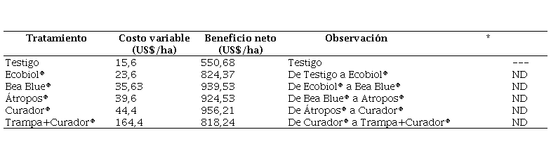 Análisis económico: Se realizó un análisis económico de presupuesto parcial (se tomaron los datos de rendimiento promedio RX) por tratamiento y el rendimiento ajustado (Rajust = 25 % de RX), el beneficio bruto multiplicando el Rajust por el precio de venta de campo. Para la sumatoria de los costos totales que varían, se estimaron los costos de los productos evaluados más el costo de aplicación de insecticidas. Para obtener el beneficio neto, se restaron los costos totales (que varían al beneficio bruto de cada tratamiento), análisis de dominancia y tasa de retorno marginal, siguiendo la metodología propuesta por el Centro Internacional para el Mejoramiento del Maíz y el Trigo (CIMMYT, 1988), la que considera diferentes costos, rendimientos y beneficios.
