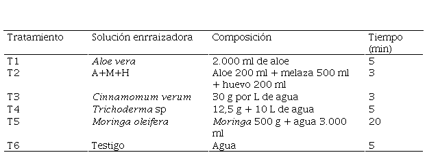 El experimento se realizó mediante un diseño completamente aleatorio (DCA) con seis tratamientos: T1-aloe vera; T2-aloe vera + melaza + huevo; T3-canela; T4-Trichodermasp; T5-Moringa oleifera; T6-testigo. Se usaron 100 esquejes por tratamiento, y cada uno se constituye como una unidad experimental, para un total de 600 unidades de esquejes que se colocaron en un área aproximada de 32,2 m. de un metro de ancho por dos metros de largo y un metro de separación.