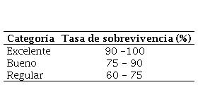 Porcentaje de sobrevivencia (%S): Se evaluó después de la primera semana del establecimiento en bolsas de vivero. La variable fue evaluada para cada uno de los tratamientos utilizando el conteo de esquejes vivos y muertos, durante el ensayo se tomó como referencia para el cálculo la ecuación [3] y categoría de sobrevivencia (Tabla 2), propuesta por Saavedra Miranda y Gutiérrez Gonzáles (2014).