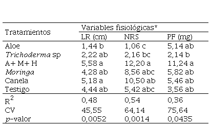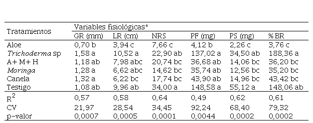 El tratamiento aloe vera y Trichoderma sp mostró las medias con menores valores para la variable NRS. En relación con las LR el tratamiento A+M+H mostró valores de medias de 5,58 cm, pero no muy diferente de los tratamientos canela, testigo absoluto, Moringa . Trichoderma sp, el tratamiento aloe vera presentó LRS menores con 1,44 cm, no diferente al testigo absoluto, Moringa y Trichoderma sp. (Tabla 3).