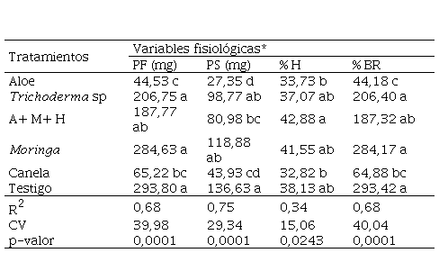 El tratamiento testigo presentó las medias con mayor valor en NRS (34,0 cm), sin embargo, no mostró diferencias significativas en relación con Trichoderma sp. El tratamiento aloe mostró las medias con menor valor para la variable de NRS, sin embargo, no tiene diferencias significativas con A+M+H, Moringa y canela. El tratamiento de Trichoderma sp presentó las medias con mayor valor en PF (137,02 mg), sin embargo, no mostró diferencias significativas en relación con A+M+H, Moringa, canela y el testigo. El tratamiento aloe mostró las medias con menor valor para la variable PF, sin embargo, no es muy diferente de A+M+H, Moringa y canela (Tabla 4).