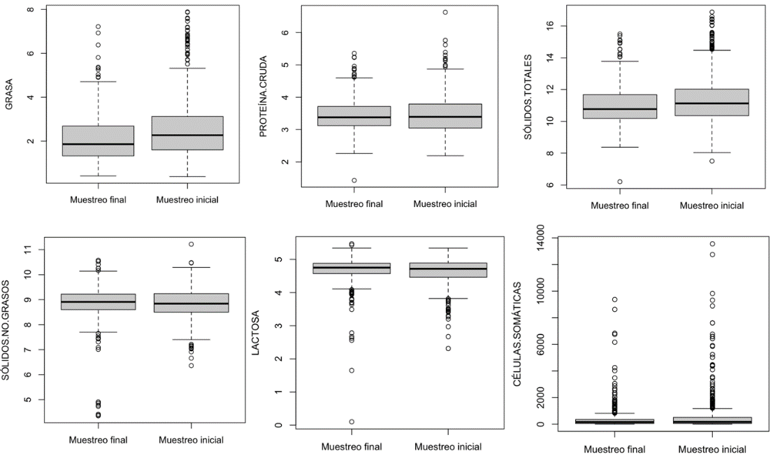 En la Tabla 4 se detalla el análisis estadístico entre los parámetros de leche cruda bovina obtenidos en los muestreos realizados antes y después de la capacitación de los pequeños productores de Pichincha, indicando los valores promedios entre cada uno, así como la comparación de medias entre los muestreos, las parroquias y los cantones estudiados. Asimismo, en la Figura 1, se detallan los diagramas de cajas (bloxplot) de los parámetros analizados, comparando entre los muestreos iniciales y los finales.
