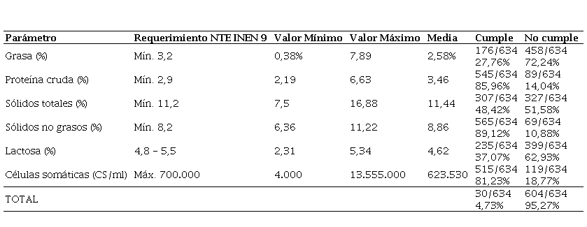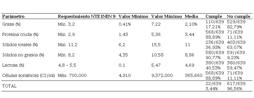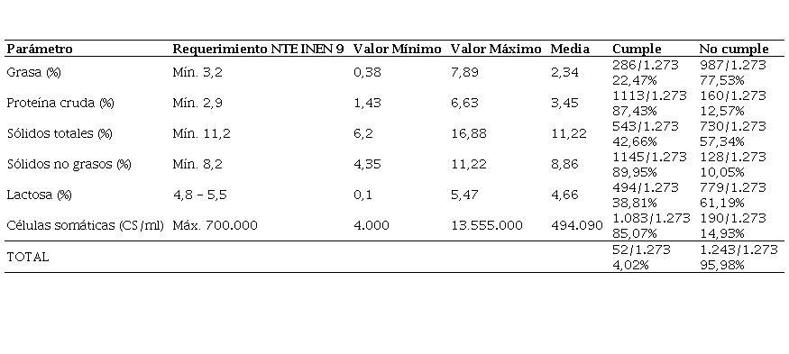 En la Tabla 1 se describen los valores obtenidos de los parámetros analizados de todas las muestras, dentro de los que se detallan los valores mínimos, máximos, la media, así como el nivel de cumplimiento general y de cada parámetro, respecto a la NTE INEN 9:2012. Se determinó que solamente el 4,02 % (52/1.273) de las muestras, cumplen con los valores referenciales de la normativa nacional, mientras que el 95,98 % (1.243/1.273) no cumple en alguno de los parámetros evaluados. Sin embargo, la gran mayoría de dicha leche sí es apta para el consumo humano, pero requiere ser mejorada en su calidad nutricional.