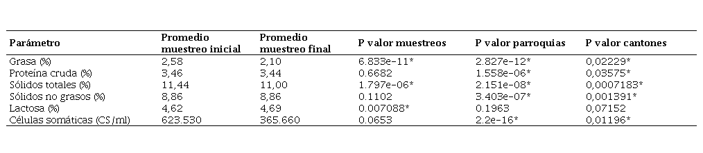 Table 4. Statistical comparison of raw bovine milk parameters by sampling, parishes and cantons.