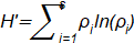 [3]El Índice de Shannon-Wiener [H’] se calculó mediante la ecuación [4]. Donde pi corresponde a la abundancia relativa, la cual consiste en la división del número de individuos de cada especie entre el total de individuos de todas las especies de la parcela de estudio multiplicado por 100; mientras que ln representa el logaritmo natural y ∑ la sumatoria.