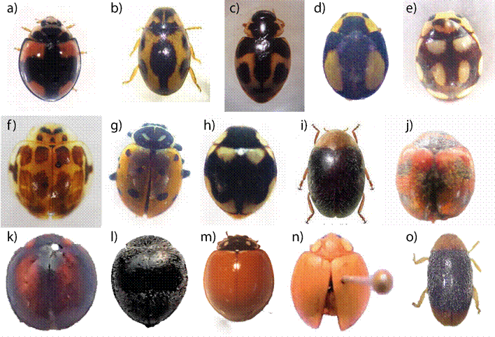 Figure 1. a) Cheilomenes sexmaculata. b) Hyperaspis onerata. c) Hyperaspis festiva. d) Hyperaspis esmeraldas. e) Cyrea alma. f) Psyllobora confluens. g) Hippodamia convergens. h) Tenuisvalvae bromelicola. i) Diomus apollonia. j) Rodolia cardinalis. k) Mada synemia. l) Azya orbigera ecuadorica. m) Cycloneda sanguinea. n) Paraneda pallidula guticollis. o) Scymnus cerinotum.