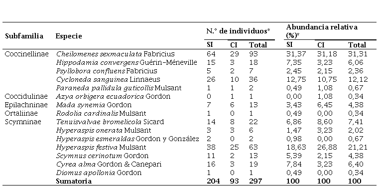 * SI: Sin aplicación de Insecticida. CI: Con aplicación de insecticida. / SI: Without insecticide application; CI: With insecticide application.En la parcela sin aplicación de insecticida [SI] se observaron 204 individuos, distribuidos en 12 géneros y 14 especies, destacándose Ch. sexmaculata con 64 individuos (31,37 %), H. festiva con 38 (18,63 %) y C. sanguinea con 26 individuos (12,75 %) (Tabla 1). En la parcela con aplicación de insecticida [CI] se encontraron 93 individuos, 11 géneros y 12 especies, sobresaliendo Ch. sexmaculata con 29 individuos (31,18 %), H. festiva con 25 (26,88 %) y C. sanguinea con 10 individuos (10,75 %) (Tabla 1).