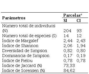 Se constató que los índices de Simpson encontrados en esta investigación (0,82 SI y 0,80 CI), sugieren alta diversidad y baja dominancia (0,17 SI y 0,19 CI).