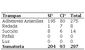 Los insectos colectados fueron adultos, para lo que se emplearon cinco técnicas de muestreo: trampas amarillas, trampas de succión, redada, trampas de luz y las trampas de caída “Pitfall”. Se colocaron cinco trampas amarillas por parcela de estudio con medidas de 0,76 m x 1,25 m, ubicadas en cinco puntos distintos del terreno (“X”) de manera permanente y evitando el efecto borde. A cada una se le colocó grasa vegetal para permitir la adherencia de los insectos.