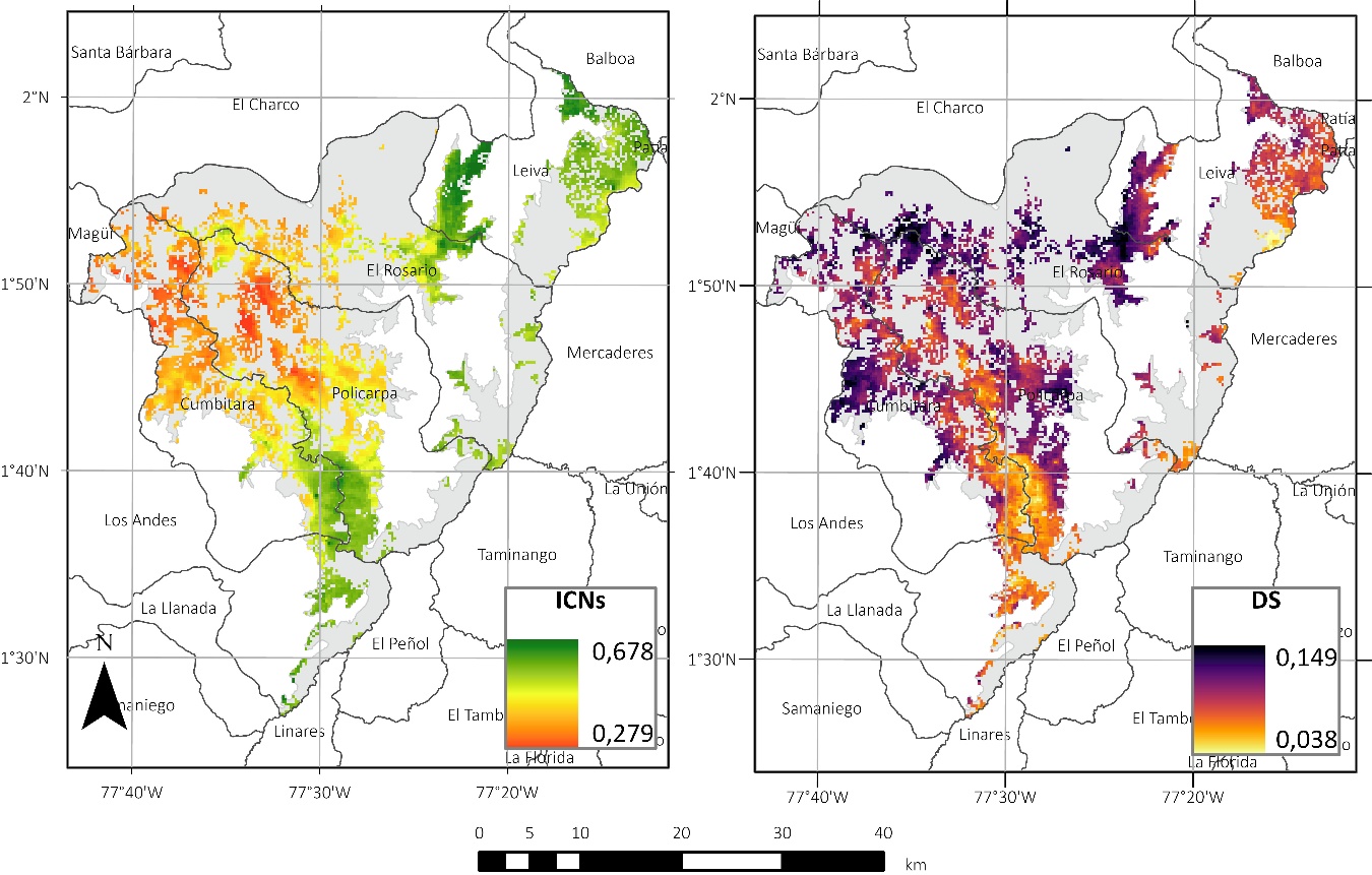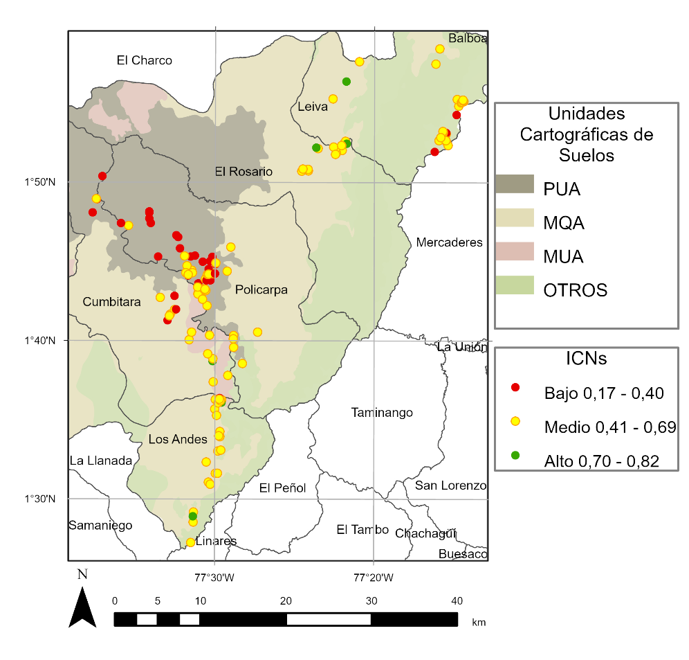 En la Figura 7 se observa la distribución espacial del ICNs en las áreas agrícolas de la cordillera nariñense. Este mapa concuerda con lo reportado por Näsi et al. (2023) quienes encontraron patrones similares de variabilidad del ICNs en áreas agrícolas. Por otra parte, los resultados se alinean con los hallazgos de Cherubin et al. (2019), quienes evaluaron la variabilidad espacial de los atributos químicos del suelo en seis usos de la tierra típicos (bosque, pastizal y cuatro sistemas agroforestales) utilizando el método de Evaluación Visual de la Estructura del Suelo [VESS] en el noroeste de la Amazonía colombiana, demostrando que estas herramientas pueden ser una estrategia para recuperar la calidad del suelo y reincorporar tierras degradadas en sistemas de producción productivos y sostenibles en las regiones amazónicas monitoreando los cambios físicos del suelo.