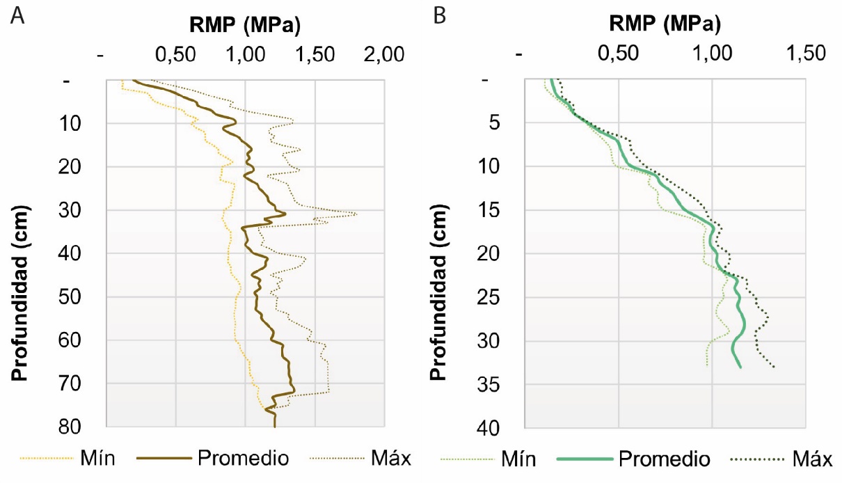En la Figura 4 se muestra de manera exploratoria el comportamiento de la RMP evaluada en las UCS con la mayor cantidad de sitios muestreados. En la UCS PUA no hay limitaciones físicas a la profundidad efectiva de los suelos hasta 80 cm. En cambio, en las UCS MQA y MUA la prueba fue interrumpida entre 20 y 35 cm de profundidad, evidenciando limitantes a la profundidad efectiva de los suelos por abundantes fragmentos de roca, corroborando lo descrito por IGAC (2004).
