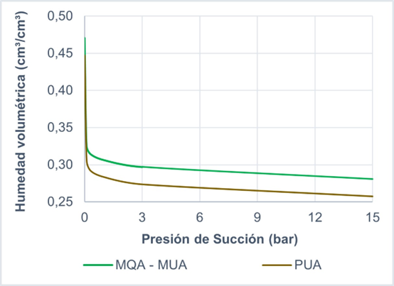 Por otro lado, la capacidad de retención de humedad fue mayor en las UCS MQA y MUA en comparación con la UCS PUA (Figura 5). Esto indica que el cultivo tiene una mayor disponibilidad de agua en el horizonte superficial del perfil de suelos en las unidades donde se encontraron los ICNs más altos. Esto está asociado al %MO, mayor en estas UCS, que contribuye a tener una mejor estructura y porosidad en los suelos y, asimismo, favorece una mejor disponibilidad y absorción de nutrientes para el desarrollo del cultivo.