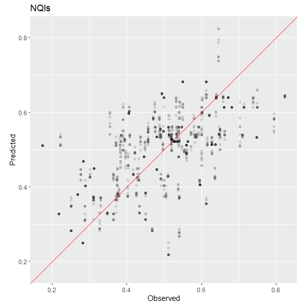 Figure 6. Observed vs. Predicted NQIs by the model. The red line represents the perfect model.