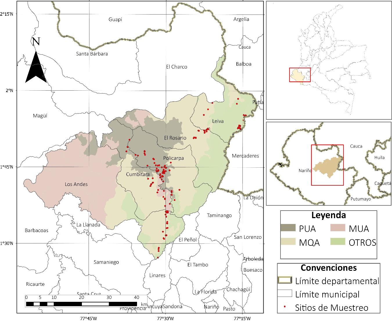 Esta investigación fue desarrollada en los municipios de Policarpa, Cumbitara, Los Andes, Leiva y El Rosario, los cuales componen la subregión cordillera del departamento de Nariño en Colombia (Figura 1). Se tomaron muestras compuestas de suelos, en los primeros 30 cm de profundidad, de 143 sitios con cultivos de cacao de más de 12 años. El muestreo se realizó entre octubre de 2020 y noviembre de 2021.