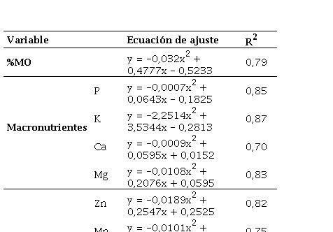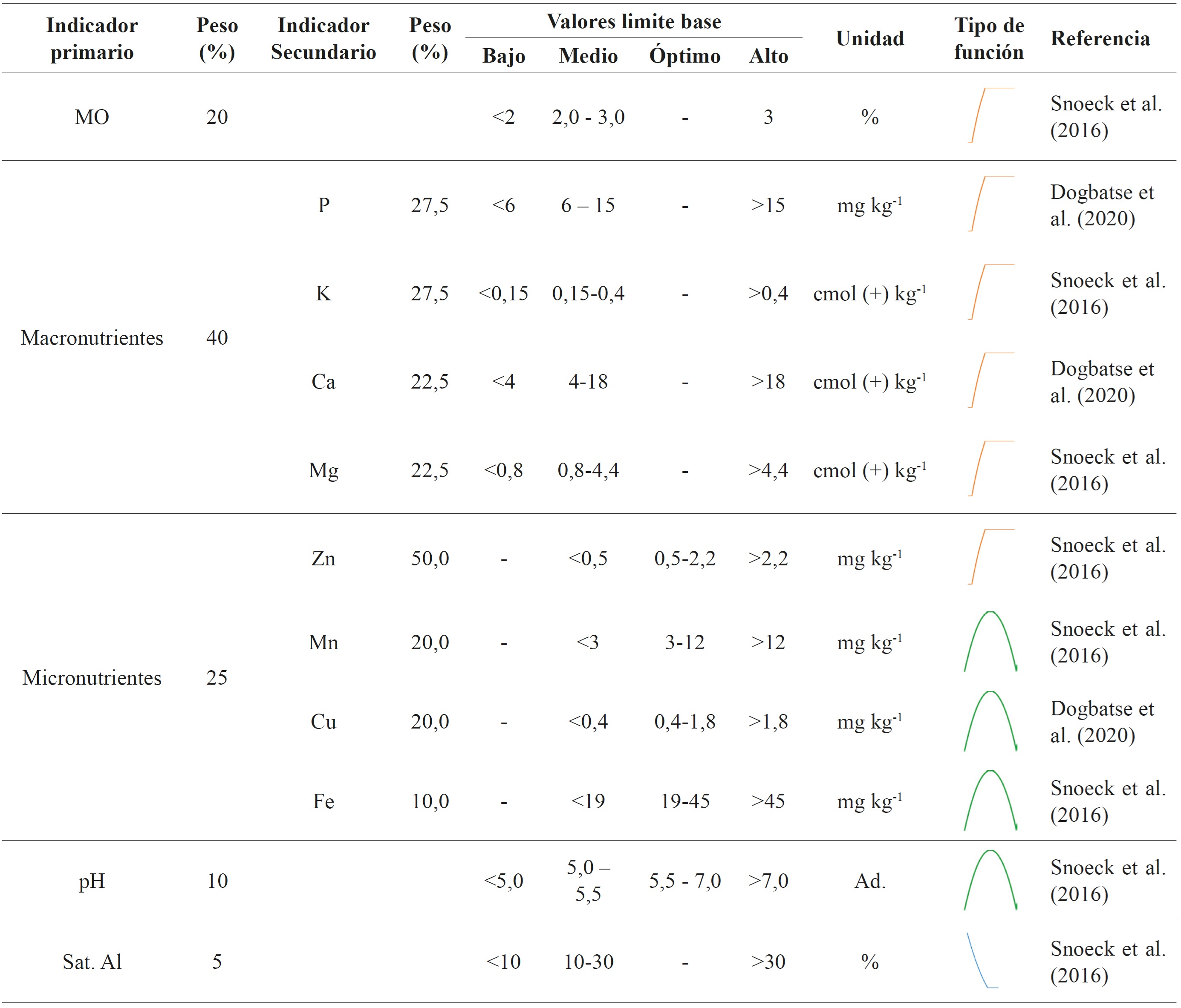 Los valores de cada variable se estandarizaron mediante funciones de puntaje de tipo “más es mejor”, “rangos óptimos” o “menos es mejor” (Andrews et al., 2004), de acuerdo con los requerimientos nutricionales (Tabla 4) del cultivo de cacao (Theobromacacao L.), y se ajustaron, mediante regresión en Microsoft Excel, a modelos cuadráticos según lo propuesto por Castillo-Valdez et al. (2021) (Figura 2 y Tabla 3).