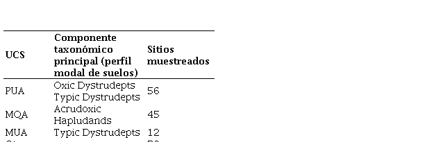 Soil Survey Staff, 2014Se identificó que 57 sitios se ubicaron en las UCS denominadas MQA y MUA, repartidos en 45 y 12, respectivamente, en el paisaje de montaña, con pendientes fuerte y moderadamente escarpadas con inclinación mayor al 25 %, climas templado húmedo y cálido húmedo (IGAC, 2004). El perfil modal de suelos de la unidad MQA corresponde a Acrudoxic Hapludands (Soil Survey Staff, 2014), es un suelo superficial, de texturas moderadamente gruesas, excesivamente drenado, muy fuertemente ácido, de fertilidad baja, con alta saturación de aluminio y con altos a bajos contenidos de materia orgánica. Por su parte, en la UCS MUA el perfil modal de suelos es Typic Dystrudepts (Soil Survey Staff, 2014), y se caracteriza por ser superficial, de texturas moderadamente finas con gravilla y cascajo, bien drenado, muy fuertemente ácido, de fertilidad natural baja y con materia orgánica media y baja (IGAC, 2004).