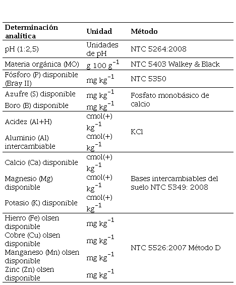 En la Tabla 2, se detallan los métodos empleados para determinar los parámetros químicos del suelo mencionados en el párrafo anterior.