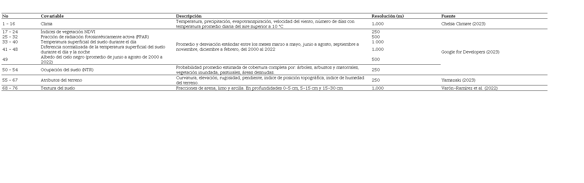 Se construyó un modelo de predicción del ICNs para estimar su valor en sitios no muestreados. El modelo se entrenó utilizando algoritmos de aprendizaje automático asistido por computadora (Machine learning). Para construir el modelo, se utilizaron 76 covariables ambientales, en formato ráster, asociadas a los factores de formación de suelos (Tabla 5). Se ajustó la resolución espacial de las covariables disponibles a un mismo tamaño de pixel, de 250 m x 250 m (ISRIC — World Soil Information, 2024) para garantizar la consistencia y uniformidad de las predicciones del ICNs. Posteriormente, mediante la estrategia de eliminación recursiva de variables [RFE], el conjunto de covariables se redujo a aquellas que mostraron mayor capacidad predictiva del ICNs (FAO, 2022).