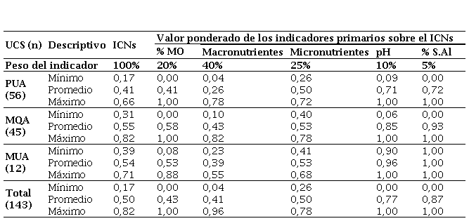 Por otra parte, los sitios en la unidad PUA, que presenta mejores condiciones de relieve y accesibilidad, obtuvieron un ICNs promedio de 0,41, con un contenido muy bajo de MO y macronutrientes (P, K, Ca y Mg).