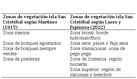 Martínez es el primer científico ecuatoriano que realiza una división geográfica de la isla San Cristóbal, de acuerdo con su vegetación, que identifica en su viaje, logrando establecer cuatro zonas, las cuales difieren de las investigaciones actuales como se puede ver en la Tabla 2.