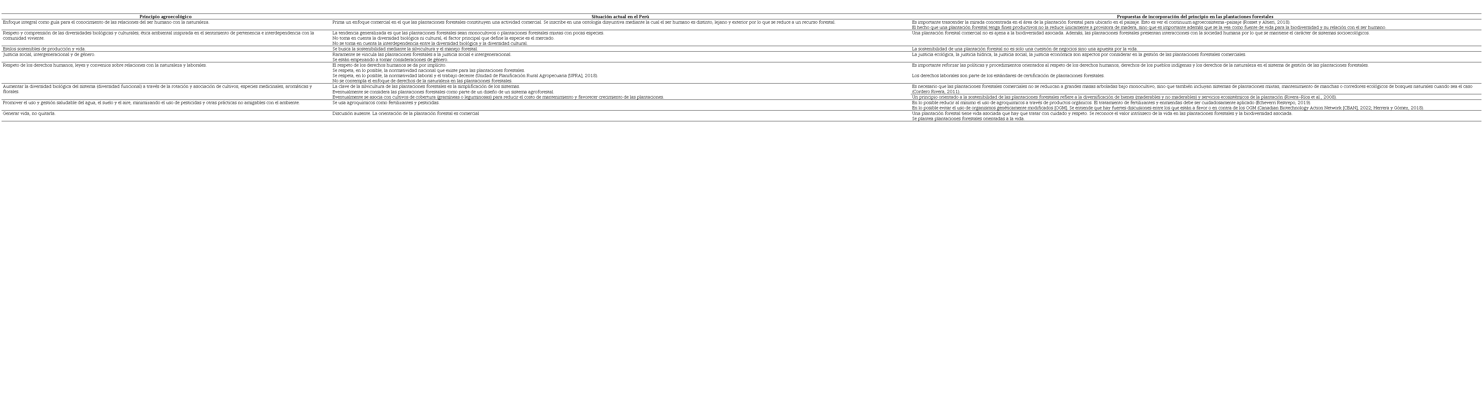 En la Tabla 1 se muestran los principios agroecológicos aplicados a las plantaciones forestales.