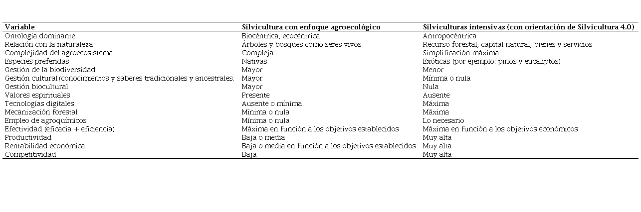 Table 2. Comparison between agroecological forestry and forestry-intensive forestry with a 4.0 orientation.