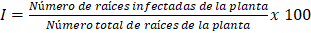 Incidencia de la enfermedad en raíces. Se evaluó con la ecuación [1] (Djeugap et al. 2016)