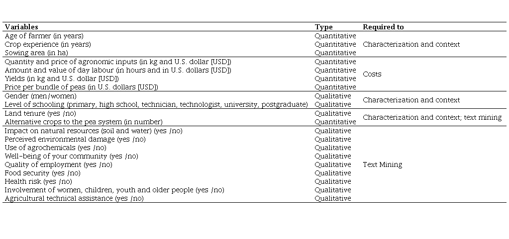 Semi-structured interviews were performed over the specified period to smallholder farmers, with 35 total interviews conducted according to the methodology outlined by Casas Anguita et al. (2003). Individual interviews were conducted with four key informants, comprising two Colombian Corporation for Agricultural Research [AGROSAVIA] researchers with experience in the southwestern region and two technical managers of the National Federation of Cereal Growers [FENALCE]). The variables collected during the meetings are presented in Table 1 for reference.