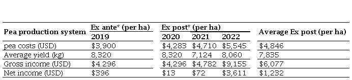 Concerning production costs (Table 2), a gradual increase in production costs was evident. This may be attributed to the rise in inflation within the country and social unrest, such as what occurred at the end of November 2019 (Guerrero Hurtado, 2022; Mejía, 2021; Payares-Meza, 2019). However, the advent of the COVID-19 pandemic led to a disruption in the agricultural dynamics due to an increase in prices of essential agronomic inputs and transportation costs, which in cases exceed 100% for some agrochemical products (Chaves Romero & Cedeño Mangona, 2021; Ministerio de Agricultura y Desarrollo Rural [MADR], 2021). In the case of pea technology, the average increase in costs compared to the ex-ante period was 24.2%.