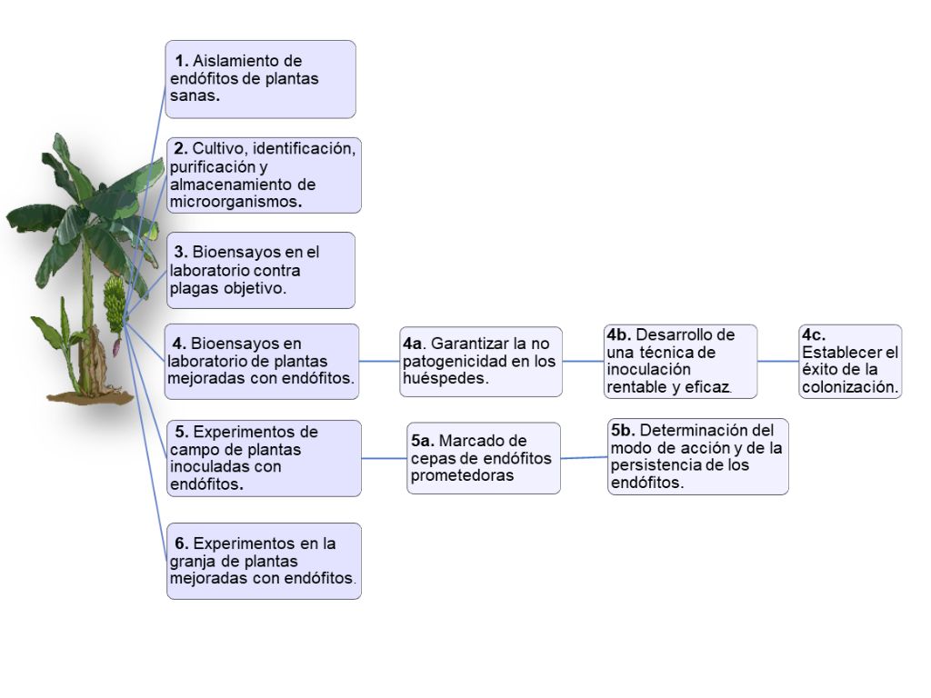 En el caso del banano se ha confirmado que existe gran diversidad de hongos endófitos, especialmente en la raíz (Gómez-Lama Cabanás et al., 2021). Pese a esto, Srivastava y Singh (2019) mencionan que, para el desarrollo de inoculantes en el banano se debe efectuar una evaluación inicial de la cepa micorrícica, con el fin de acoplar la dosis y tipo de inoculante apropiada para cada cultivo de Musa spp. Es así como, Ochieno (2020) propone un protocolo para el análisis de endófitos en el banano (Figura 1).