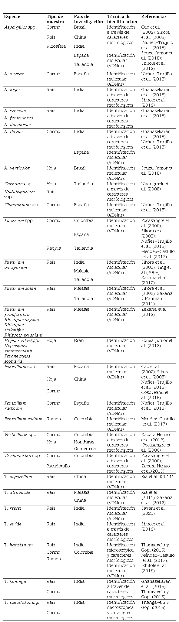 Durante los últimos años se han realizado varios estudios de aislamiento y caracterización de hongos endófitos asociados al banano en diferentes regiones del mundo, que han logrado aislar e identificar diferentes grupos taxonómicos de hongos endófitos a través de técnicas moleculares y/o caracteres morfológicos de cultivos puros (Cao et al., 2002; Gnanasekaran et al., 2015; Méndez-Castillo et al., 2017; Nuangmek et al., 2008; Núñez-Trujillo et al., 2013; Pocasangre et al., 2000; Savani et al., 2021; Shitole et al., 2019; Souza Junior et al., 2018; Thangavelu y Gopi 2015; Ting et al., 2008; Xia et al., 2011; Zakaria et al., 2016; Zapata Henao et al., 2019). Los resultados obtenidos por estas investigaciones se muestran en la Tabla 1, considerando las especies que tienen una mayor frecuencia de aparición.