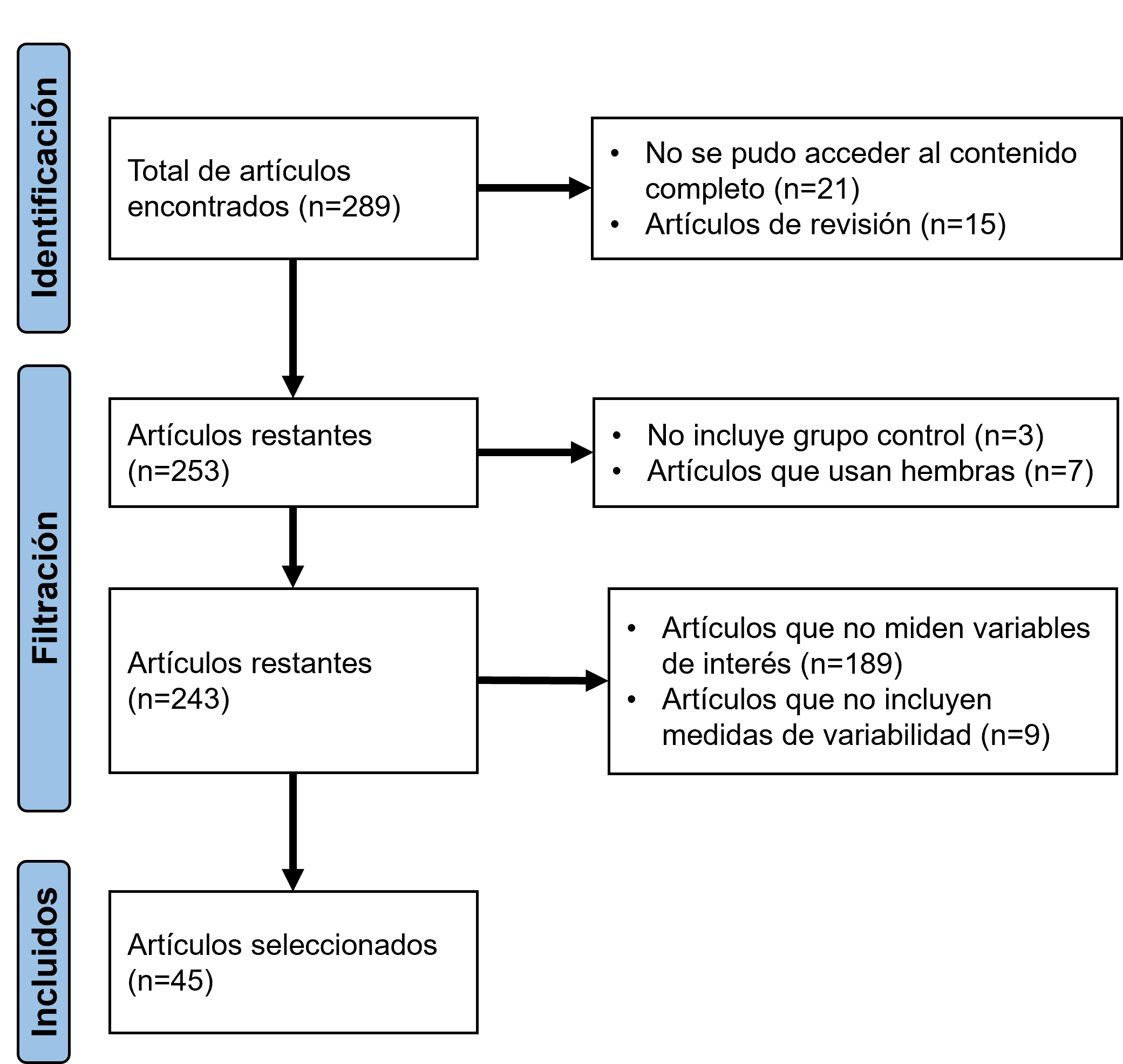 Las variables de interés utilizadas fueron ganancia diaria de peso [GDP] (g día-1), consumo diario de alimento [CDA] (g día-1), conversión alimenticia [CA] (kg kg-1), eficiencia alimenticia [EA] (kg kg-1), porcentaje magro (%), enrojecimiento y pH (30-45 min y 24 h). Finalmente se seleccionaron un total de 45 artículos (Figura 1): Aluwé et al. (2013, 2015), Andersson et al. (2012), Andreo et al. (2018), Argemí-Armengol et al. (2022), Batorek et al. (2012), Bonneau et al. (1994), Braña et al. (2013), Channon et al. (2018), Cronin et al. (2003), Dalla Costa et al. (2020), Daza et al. (2016), Dunshea et al. (2001), Fernandes et al. (2017), Font-i-Furnols et al. (2012), Fuchs et al. (2009), Grela et al. (2013, 2018), Iocca et al. (2015), Jeong et al. (2011), Kantas et al. (2014), Kress et al. (2019), Lealiifano et al. (2011), Metz et al. (2002), Molist et al. (2014), Morales et al. (2010, 2013), Needham y Hoffman (2015), Needham et al. (2017), Oliver et al. (2003), Oliviero et al. (2016), Pauly et al. (2009), Pérez-Ciria et al. (2022), Puls et al. (2014a, 2014b), Quiniou et al. (2012), Rikard-Bell et al. (2009), Seiquer et al. (2019), Škrlep et al. (2010, 2012, 2020a), Turkstra et al. (2002), van den Broeke et al. (2022), Zamaratskaia et al. (2008), Zoels et al (2020).