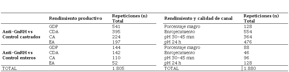 La inmunocastración cuenta con información científica publicada acerca del efecto de la aplicación de la vacuna anti-GnRH sobre el rendimiento productivo y la calidad de canal en porcinos. Los resultados son variables entre sí e incluyen un sin número de factores (edad de aplicación, intervalo entre dosis, niveles dietarios de energía, proteína, peso de faenamiento), que dificulta el análisis para poder conocer el beneficio de esta vacuna (Basulto Baker, 2020). Por lo anterior, este artículo tiene por objetivo analizar el efecto de la aplicación de la vacuna anti-GnRH sobre la calidad de canal y el rendimiento productivo en porcinos a través del uso de meta-análisis.