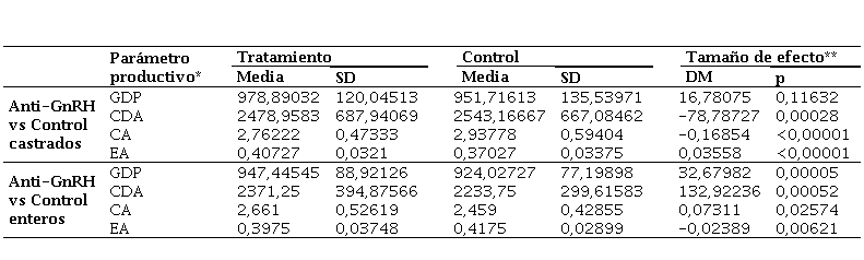 El efecto expresado como la diferencia de medias [DM] de los grupos analizados indico un incremento de GMD de 16.78 g día-1 en el grupo de inmunocastrados en comparación con el grupo control castrados quirúrgicamente. Así mismo, se observa un aumento de la GDP en 32,67 g día-1 (p = 0,00005) por encima del grupo control enteros (Tabla 2).