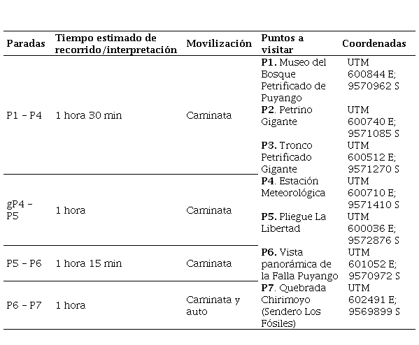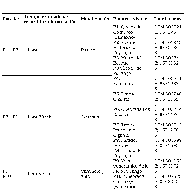 El tiempo de recorrido depende del enfoque investigativo y el interés del visitante. La ruta prioriza geositios, atractivos geológicos y servicios turísticos, excluyendo espacios recreativos por su carácter científico (Figura 3).