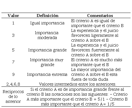 En la Fase 1 se determinaron los criterios y las alternativas de análisis para los geositios y atractivos turísticos. Estos criterios fueron: nueve de valoración científica (representatividad, localidad tipo, conocimiento científico, conservación, rareza, diversidad, espectacularidad y belleza, condiciones de observación, asociación con otros patrimonios) y tres de uso recreativo (contenido/uso divulgativo, posibles actividades a realizarse, accesibilidad) (Cendrero Uceda, 1996). Para la jerarquización de los criterios, Fase 2, se aplicó la matriz de comparación pareada; el resultado de esta fue un vector propio que indica el grado de importancia o interés de cada criterio. En cuanto a la ponderación, se utilizó la escala fundamental de Saaty (1980) de la Tabla 1.