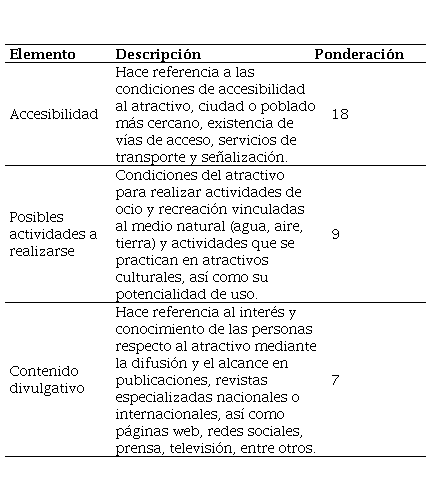 MINTUR (2018), Cendrero Uceda (1996).Es importante aclarar que la valoración presentada en la metodología MINTUR admitió ponderar los criterios en la Fase 2.