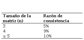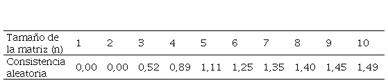 [2]Donde, el valor de la consistencia aleatoria [CA] está en función del tamaño de la matriz (Tablas 3 y 4).