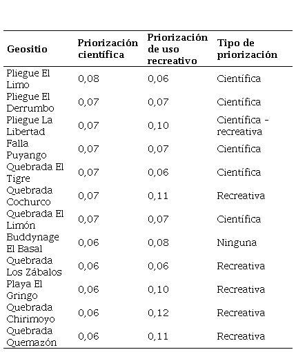 Aplicada la metodología Saaty (1980), seis geositios fueron priorizados bajo los criterios de valor científico, aunque se encontró que la mayoría de ellos tiene un alto valor en los criterios: representatividad, localidad tipo y asociación con otros patrimonios. En los criterios de uso recreativo fueron priorizados seis geositios, resaltando los criterios: contenido/uso divulgativo y las posibles actividades a realizarse. En los recorridos se seleccionaron cinco geositios de alto valor intrínseco que posibilitan la difusión del conocimiento científico geológico y están conectados con otros atractivos de igual valor. En la Tabla 5 se muestra la priorización científica y recreativa: