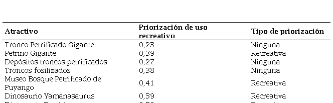 Por otra parte, se registraron ocho atractivos turísticos en los senderos existentes (Tabla 6); siete de ellos son de interés geológico. Los criterios de uso recreativo significativos fueron: la accesibilidad y las posibles actividades a realizarse. De los ocho atractivos se priorizaron cuatro de interés geológico. Se evidenció una diferencia sustancial en el criterio contenido/uso divulgativo del tronco petrificado gigante, a pesar de no formar parte de la priorización de atractivos. Al ser el ejemplar más completo e importante de madera petrificada y por su alto valor divulgativo, fue considerado dentro de las rutas geoturísticas, tomando en cuenta la importancia de la conservación y valorización del patrimonio geológico.