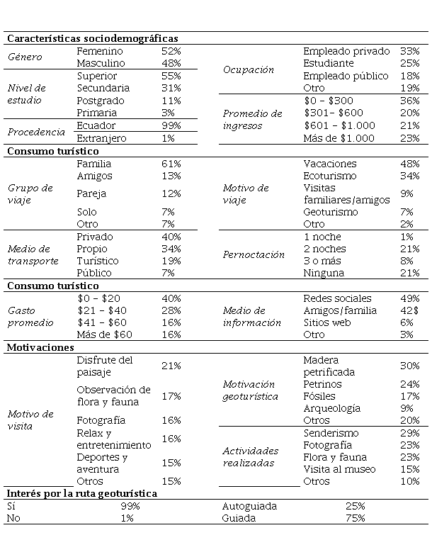 Una vez realizado el diagnóstico, se determinó el perfil del visitante (Tabla 7), denominado geoturista en esta investigación, y se consideraron los datos arrojados de la encuesta para elaborar la propuesta de rutas geoturísticas.