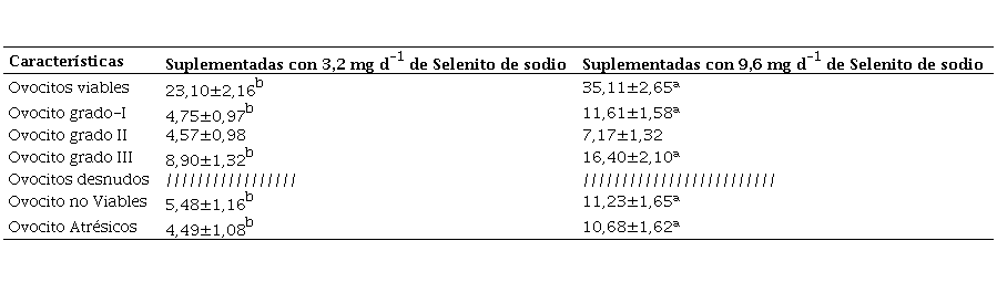 Con respecto a la influencia de la suplementación de Selenio en la eficiencia de las técnicas de transferencia de embriones, Moraes et al. (2012) desarrollaron una investigación enfocada en evaluar el efecto de la suplementación de Selenio y demostraron como resultados que la aspiración folicular de Ovocito [OPUS] y el proceso de Producción in vitro en donante de la raza Jersey, al utilizar la suplementación de 9,6 mg de selenio diario en la dieta, produjo el incremento del número total de Ovocito colectados de los grado I y II con respecto a un grupo control (p < 0.05). Este resultado puede ser atribuido al efecto de protección que ejerce este micro elemento contra el daño oxidativo. Basado en estos hallazgos recomendaron la implementación de esta estrategia de suplementación con el objetivo de mejorar la cantidad y la calidad de los Ovocito recolectados y aumentar la tasa de embriones obtenidos durante el proceso de producción in vitro (Tabla 1).