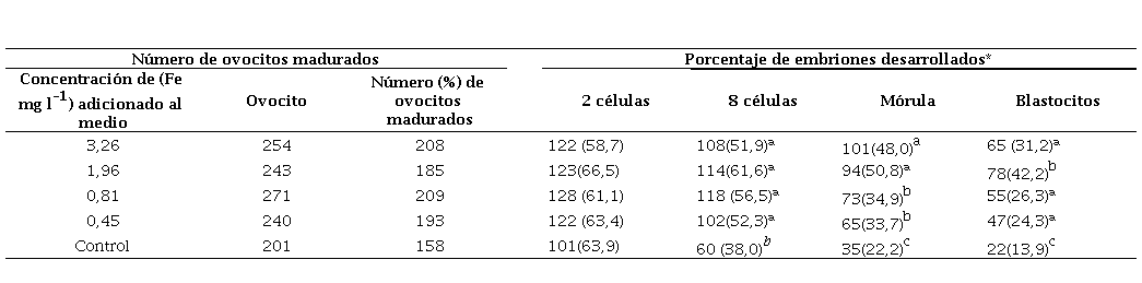 Table 4. Effect of Fe concentration in in vitro embryo culture medium on the rate of maturation and subsequent embryonic development.