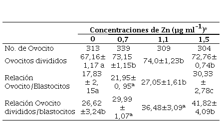 Table 5. Development capacity of the bovine oocyte fertilized and matured in vitro with various concentrations of Zinc.