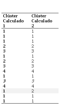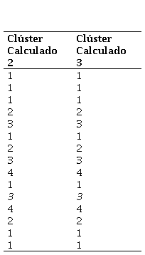 Seguido, se calculó el valor de convergencia SSE [Sum of Squared Errors o Suma de Errores Cuadráticos], obteniendo SEE = 3.120,625, dado que la asignación del Clúster original (Tabla 7) es diferente de la nueva asignación de grupo (Tabla 8), el algoritmo aún no ha convergido y así se continuó. Simplemente se copió la última asignación de clúster calculado en el rango y se repitieron los mismos pasos.